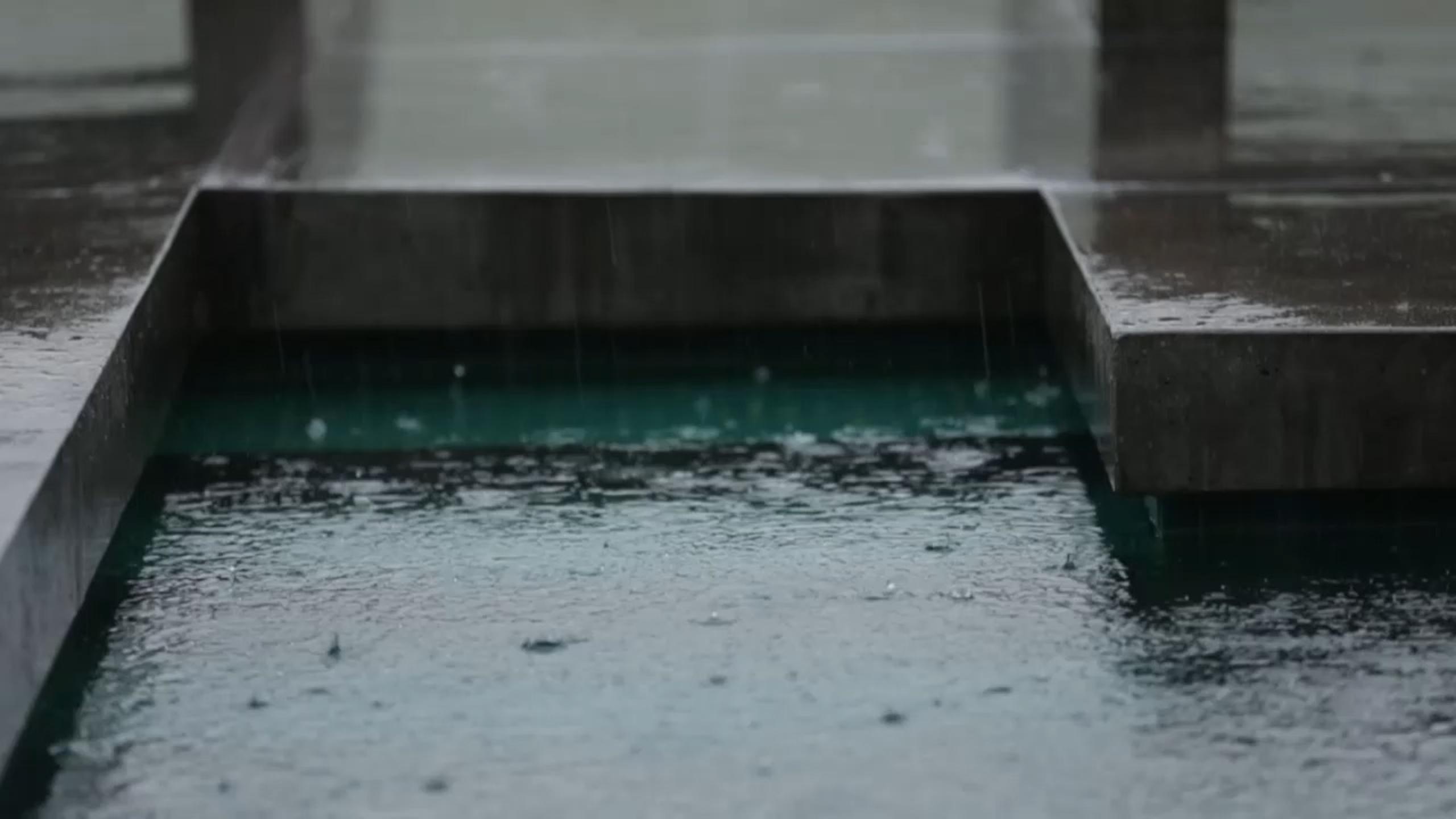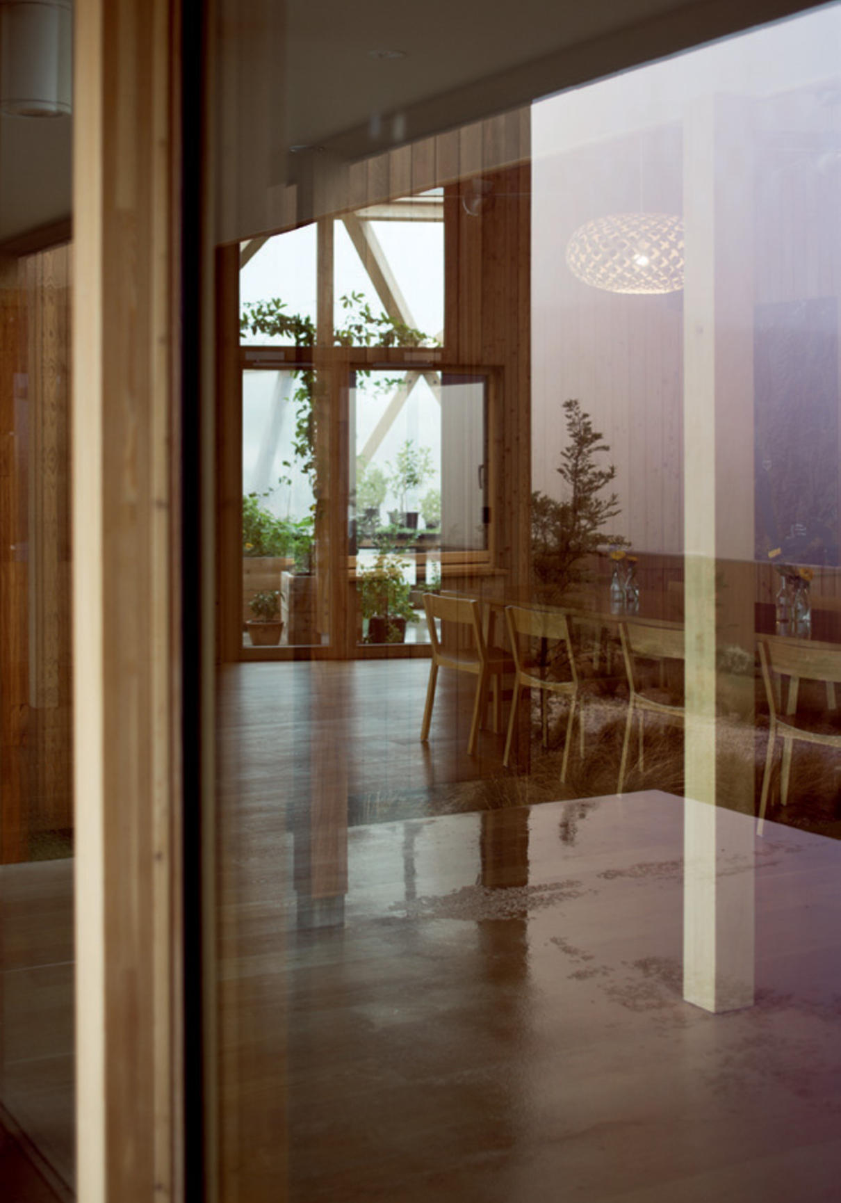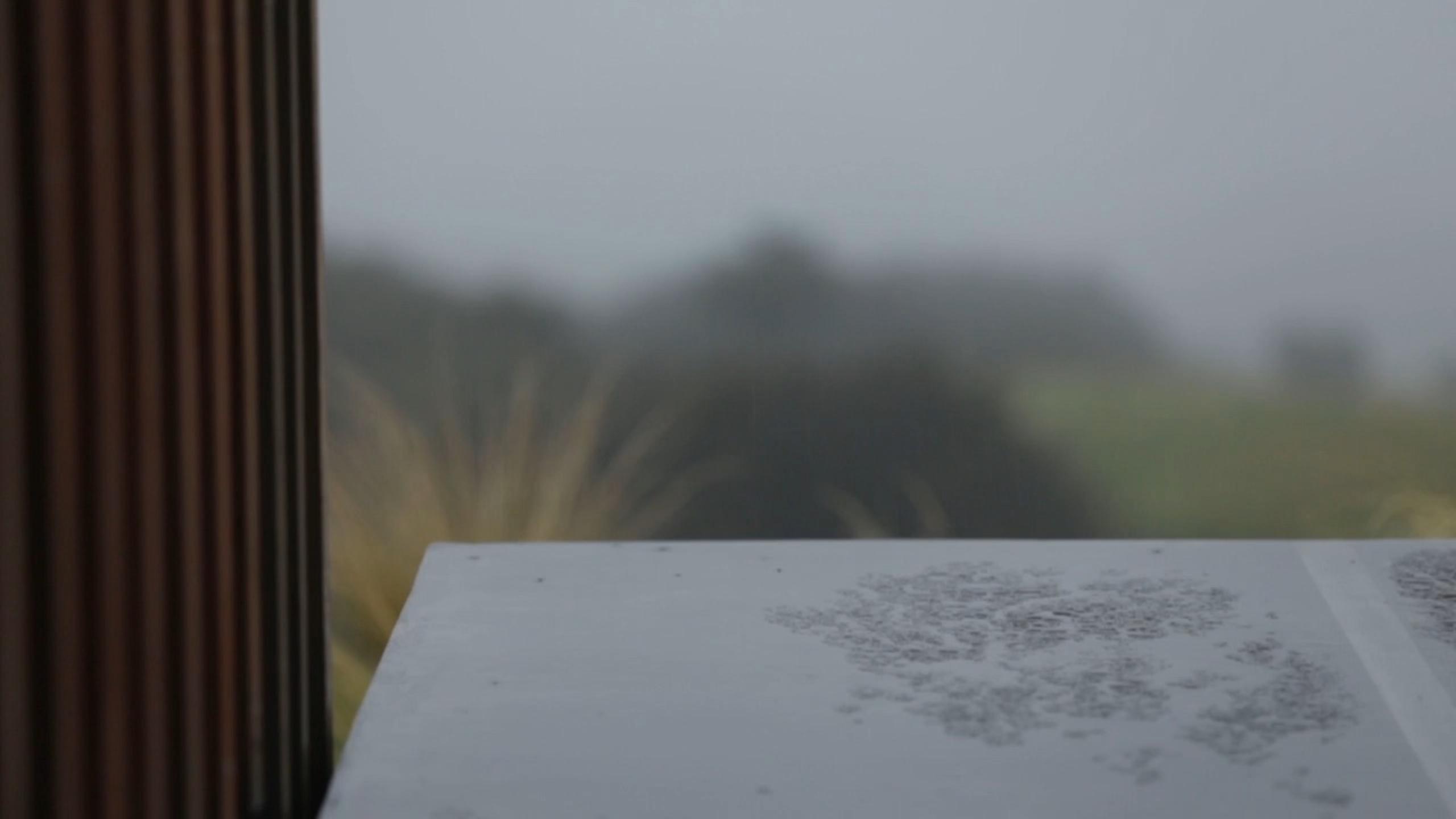 We are talking in the glasshouse, where triangular panels of opaque plastic sit within a heavy timber structure that fan out in geometric starbursts. The rain falling on the stretched and resonant fabric seems to be amplified as if it was slapping a beat on the surface of a drum. It was deafening when you first walked into the breezeway, but soon became calming, the white noise eclipsing any mental chatter.
