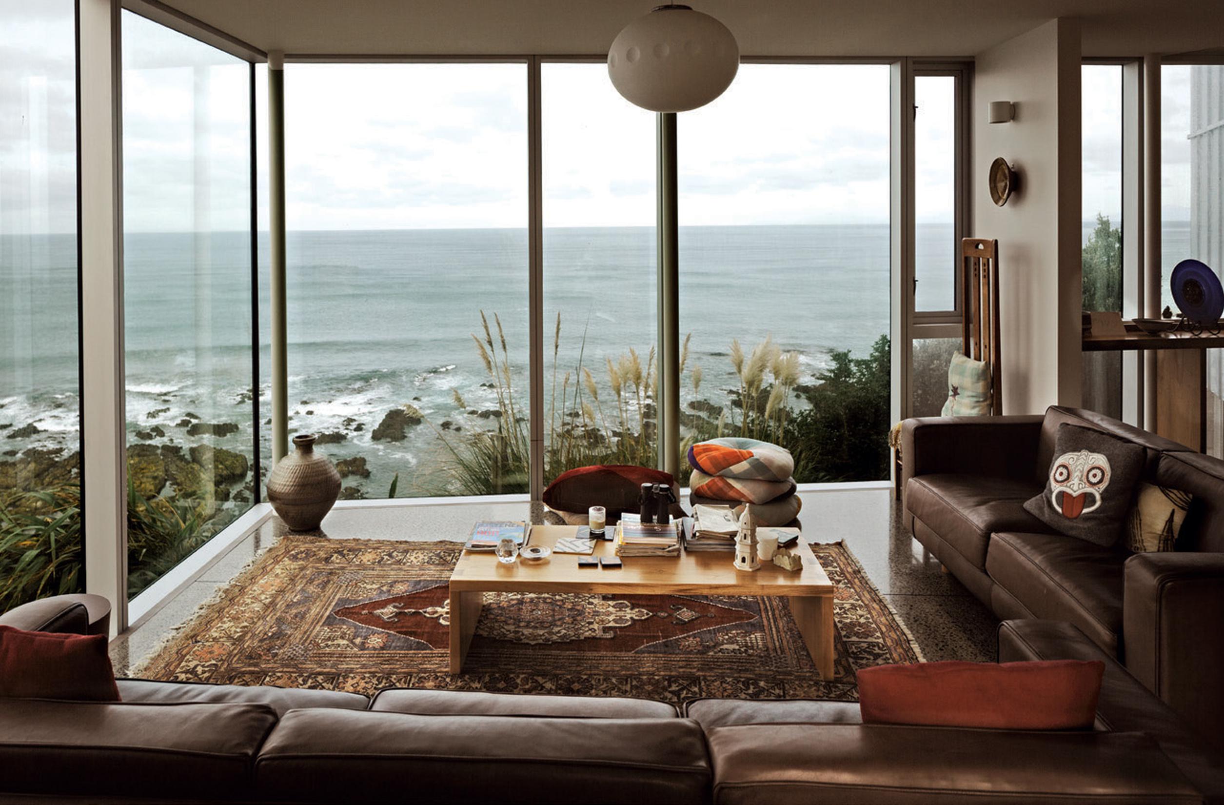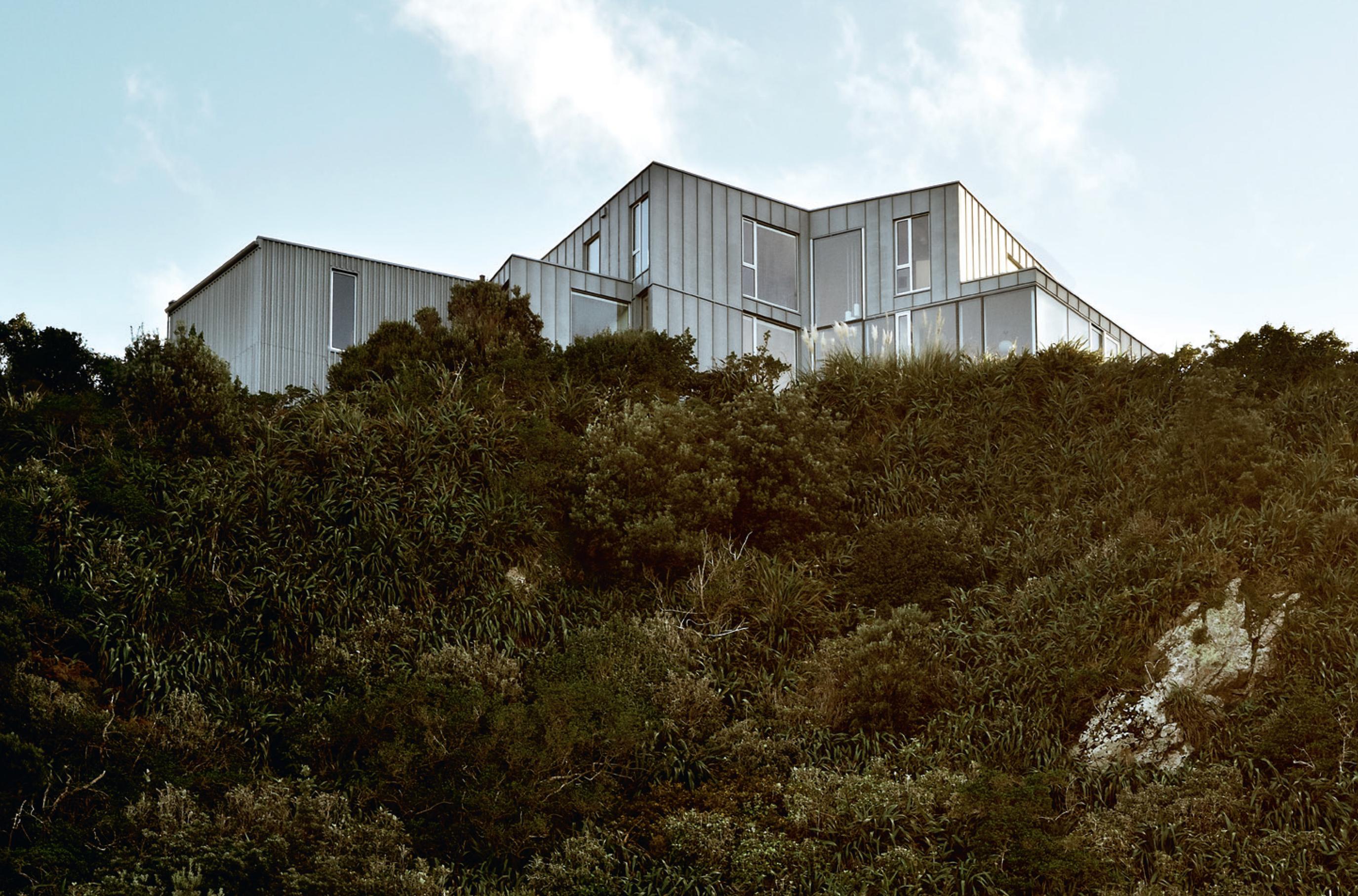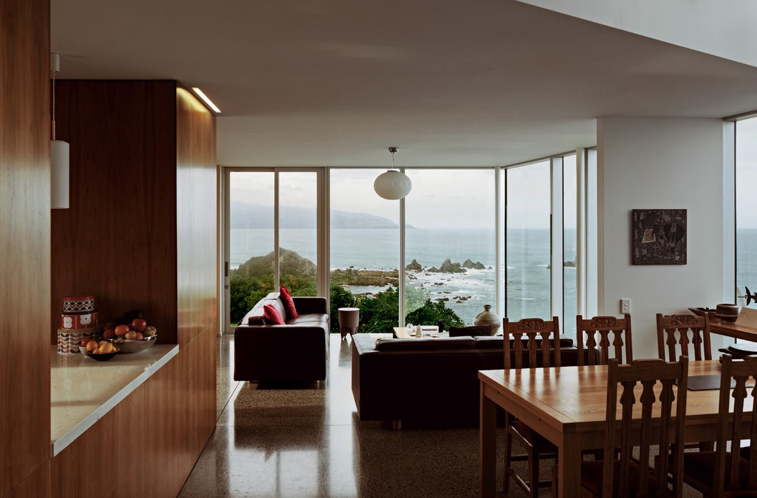 An appreciation of the weather is seen in small details: zinc was selected as cladding for its low maintenance, durability and weathertightness in the face of extreme salt laden winds from the south; the covered vestibule that allows wind-ravaged visitors to let themselves in through the exterior gate and wait, sheltered from the inevitable southerly, for someone to answer the door. On days when the sun streams in, the concrete of this outdoor room is heated by the sun, and, as it is a single pad running into the house, the glasshouse-like heat warms the house. And rather than a deck, Tennent Brown designed the house to the edge with large picture windows making the view as immediate as if you were standing on a deck. The difference is, of course, that in this house, you are also warm and sheltered while you watch the weather roll towards you from the horizon.