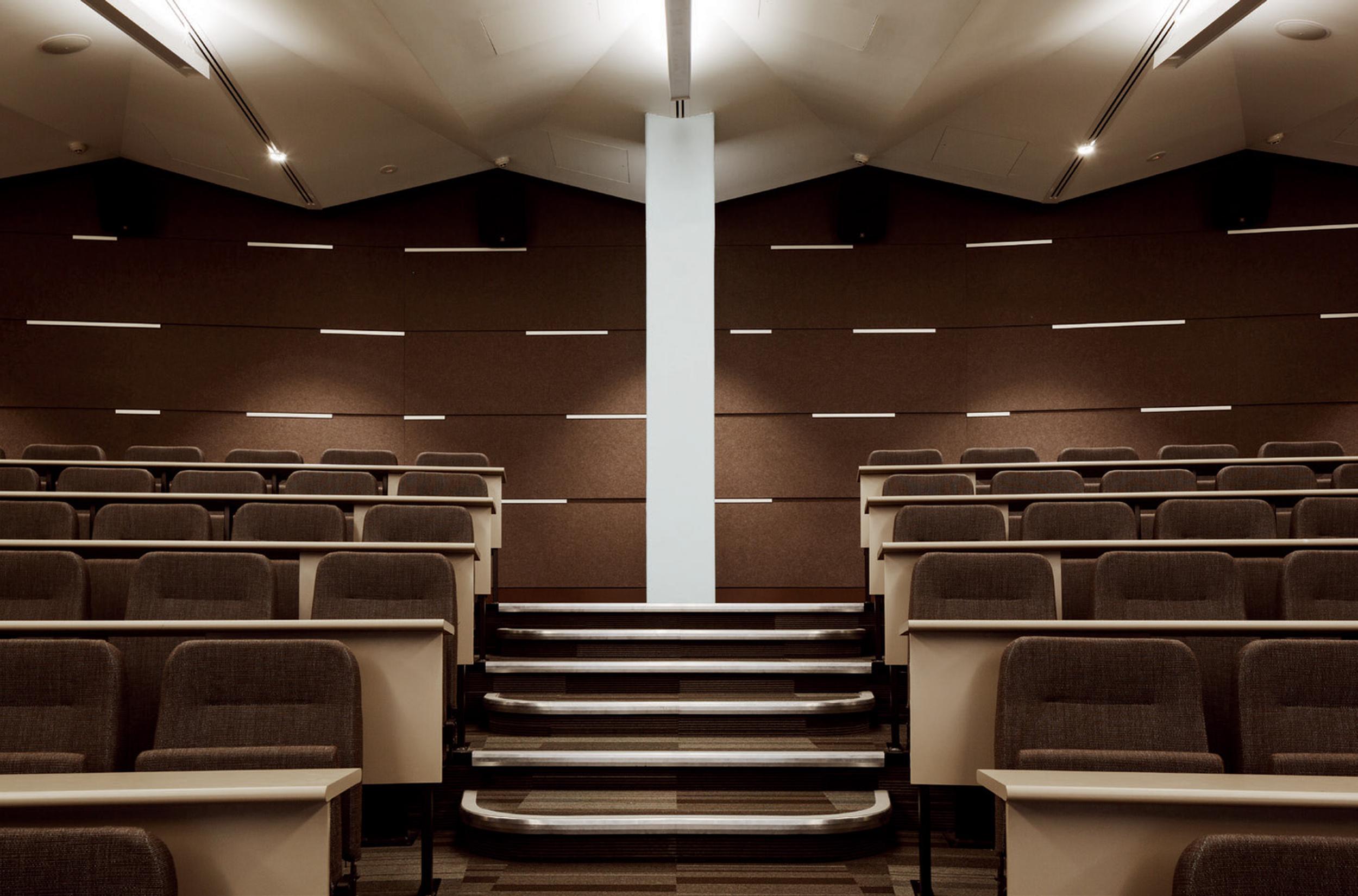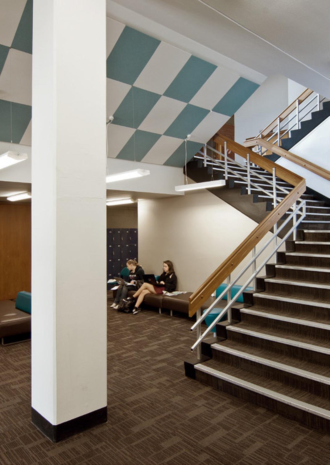 Offices and research spaces have been walled in glass and connected to a strong central space encouraging a more visible, interconnected and collaborative culture. Giving some decoration and lending some privacy, the rooms have thin vertical boards screening the glass. As this area houses the computer engineering department, the vertical strips have been cut and routed in patterns modelled on circuit boards, adding a subtle nod to the department’s context.